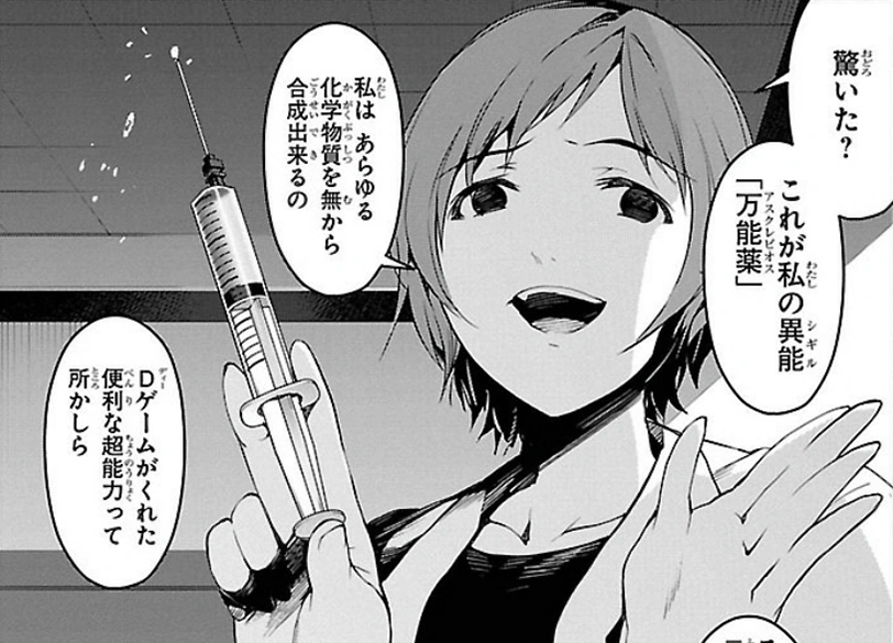Asclepius allowed Amagasa to create chemical substances from nothing within a 30 centimeter radius of herself. She had been shown to create propofol, napalm made from certain substances, chemicals that remove body limitations, and various types of gases.