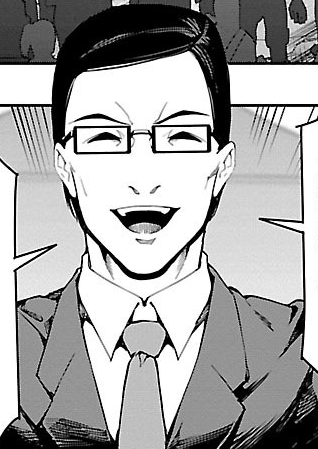 Hideaki had short black haired that was neatly combed and wore glasses. He wore a suit.