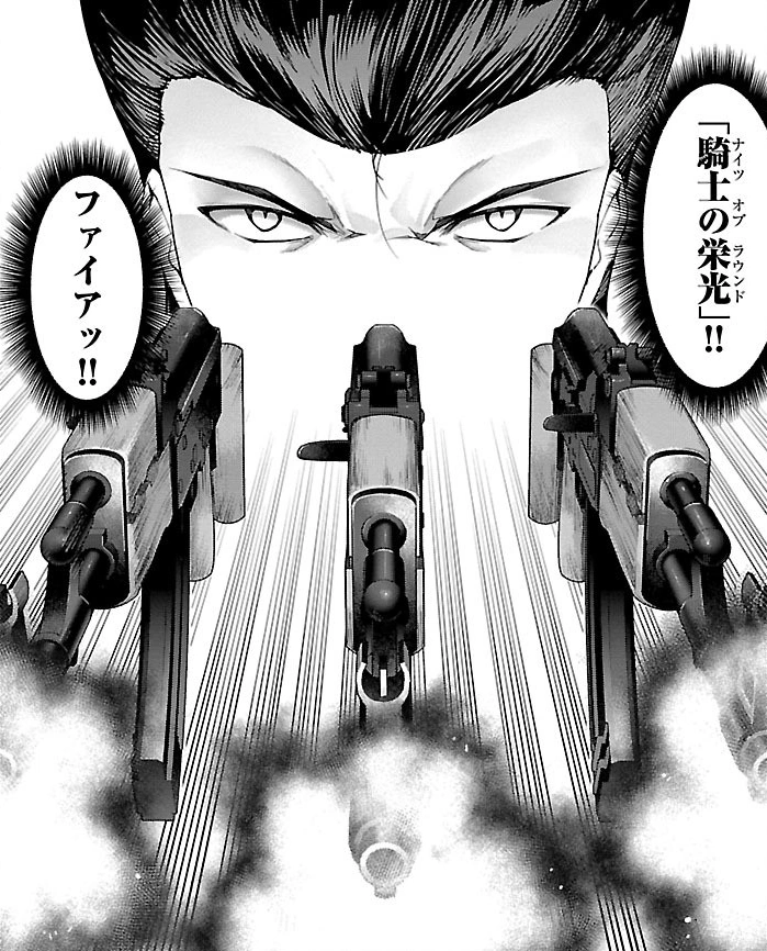 Knights of Round allows Takeshi to telekinetically control metal, specifically weapons. During the Hunting Game event, he was shown to control 15 automatic rifles by himself.