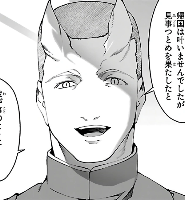 Seitarou has a shaved head with two horns on his forehead. He wears a complete military uniform consisting of a uniform top, pants, and boots.